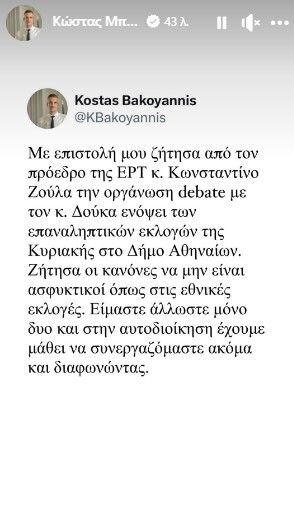 Ο κ. Μπακογιάννης, ζήτησε από τον πρόεδρο της ΕΡΤ Κωνσταντίνο Ζούλα να διοργανώσει η δημόσια τηλεόραση debate με τον κ. Δούκα. Σε σχετική ανάρτησή του στα κοινωνικά δίκτυα ο Δήμαρχος Αθηναίων επισημαίνει ότι ζήτησε οι κανόνες να μην είναι ασφυκτικοί όπως στις εθνικές εκλογές. «Είμαστε, άλλωστε, δύο μόνο και στην αυτοδιοίκηση έχουμε μάθει να συνεργαζόμαστε ακόμα και διαφωνώντας» σημειώνει χαρακτηριστικά ο κ. Μπακογιάννης στην ανάρτησή του.