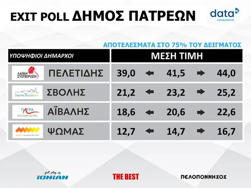 Στο 75% του δείγματος που δημοσιεύτηκε, ο νυν δήμαρχος Κώστας Πελετίδης καταγράφει από 39% μέχρι 44% με μέση τιμή 41,5%. Δεύτερος ο Κώστας Σβόλης με ποσοστό από 21,2% μέχρι 25,2% και μέση τιμή 23,2%. Τρίτος ο Αϊβαλής με ποσοστό από 18,6% έως 22,6% με μέση τιμή 20,6%. Τέταρτος ο Ψωμάς με ποσοστό 12,7% έως 16,7% και μέση τιμή 14,7%.