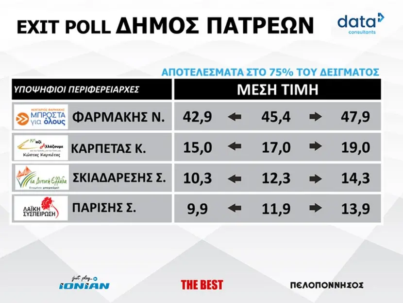 Σε ό,τι αφορά την Περιφέρεια Δυτικής Ελλάδας, ο Νεκτάριος Φαρμάκης καταγράφει ποσοστό από 42,9% μέχρι και 47,9% με μέση τιμή 45,4%. Ακολουθεί ο Κώστας Καρπέτας με ποσοστό από 15% έως 19% και μέση τιμή το 17%. Ο Σκιαδαρέσης ακολουθεί με 10,3% έως 14,3% και μέση τιμή το 12,3% και ακολουθεί ο Σωτήρης Παρίσης με 9,9% έως 13,9% και μέση τιμή 11,9%.