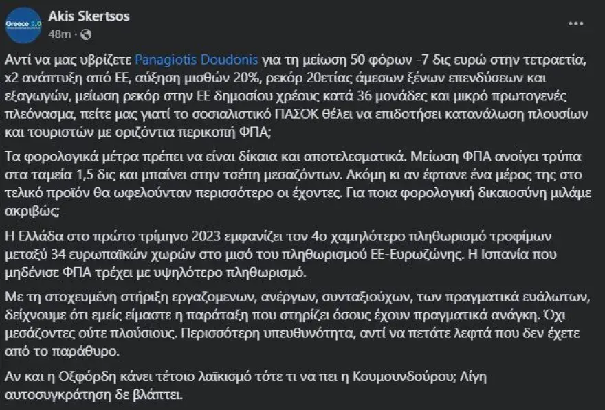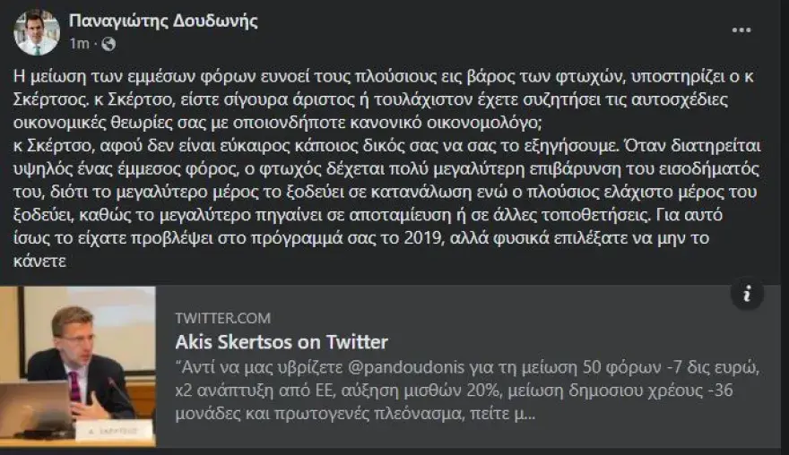 Συγκεκριμένα, ο Άκης Σκέρτσος θέτει ερωτήματα για την φορολογική πολιτική του ΠΑΣΟΚ, υπογραμμίζοντας ότι τα φορολογικά μέτρα πρέπει να είναι δίκαια και αποτελεσματικά. Μάλιστα, καταλήγει να ψέγει προσωπικά τον κ. Δουδωνή κατηγορώντας τον για λαϊκισμό. Όπως αναφέρει χαρακτηριστικά «αν και η Οξφόρδη κάνει τέτοιο λαϊκισμό τότε τι να πει η Κουμουνδούρου; Λίγη αυτοσυγκράτηση δε βλάπτει».