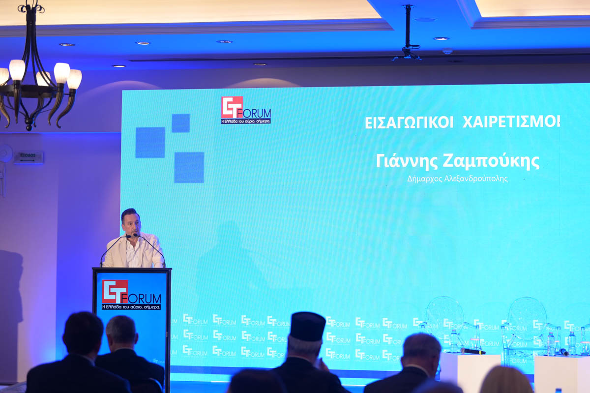 Έπειτα ο Δήμαρχος Αλεξανδρούπολης, Γιάννης Ζαμπούκης επισήμανε: «Καλώς ήρθατε στην Αλεξανδρούπολή μια πόλη που τα τελευταία χρόνια αναδεικνύεται σε πυλώνα σταθερότητας, ανάπτυξης και εξωστρέφειας για ολόκληρη την Ανατολική Μακεδονία και Θράκη και όχι μόνο. Ένας Δήμος που συχνά πυκνά επιλέγεται ως τόπος φιλοξενίας και διοργάνωσης, Διεθνών forum και ημερίδων που αποτελούν αφορμή για την Έναρξη ποικίλων συζητήσεων αλλά και αντιδράσεων. Συζητήσεις που αφορούν τα συγκριτικά πλεονεκτήματα της περιοχής μας που την καθιστούνε μοναδική ως προς τα αντίστοιχα τεταμέλια της ξηράς σε αντιδιαστολή με τα αντίστοιχα στενά του Βοσπόρου καθώς η ύπαρξη και λιμανιού και σιδηροδρόμου και Εγνατίας οδού και αεροδρομίου της δίνουν αυτό το δικαίωμα. Ακόμη συζητάμε για την ανάπτυξη των υποδομών και την συνδεσιμότητα ως καθοριστικούς παράγοντες για την Περιφερειακή μας ανάπτυξη. Η Αλεξανδρούπολη έχει πολλάκης χαρακτηριστεί ως διαμετακομιστικός κόμβος αναμένοντας από τις εξαγγελίες να περάσουμε επιτέλους στην πράξη».