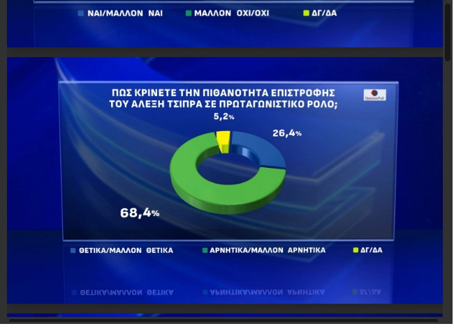 Στη δημοσκόπηση της Opinion Poll, τα ποσοστά του ΣΥΡΙΖΑ είναι 6,1% στην πρόθεση ψήφου και 5,1% στην πρόθεση ψήφου επί των εγκύρων, που σημαίνει ότι τον Αλέξη Τσίπρα θέλει ξανά πίσω στην ενεργό πολιτική σκηνή το 62,4% του 6,1%! Την ίδια στιγμή, το 68,4% (δηλαδή περίπου οι 7 στους 10) του συνόλου των ερωτηθέντων δηλώνει ότι βλέπει αρνητικά το σενάριο να δούμε ξανά σε ενεργό ρόλο τον Αλέξη Τσίπρα στην ελληνική πολιτική σκηνή. Και αυτό από κάποιους «βαπτίστηκε» μεγάλη δυναμική…