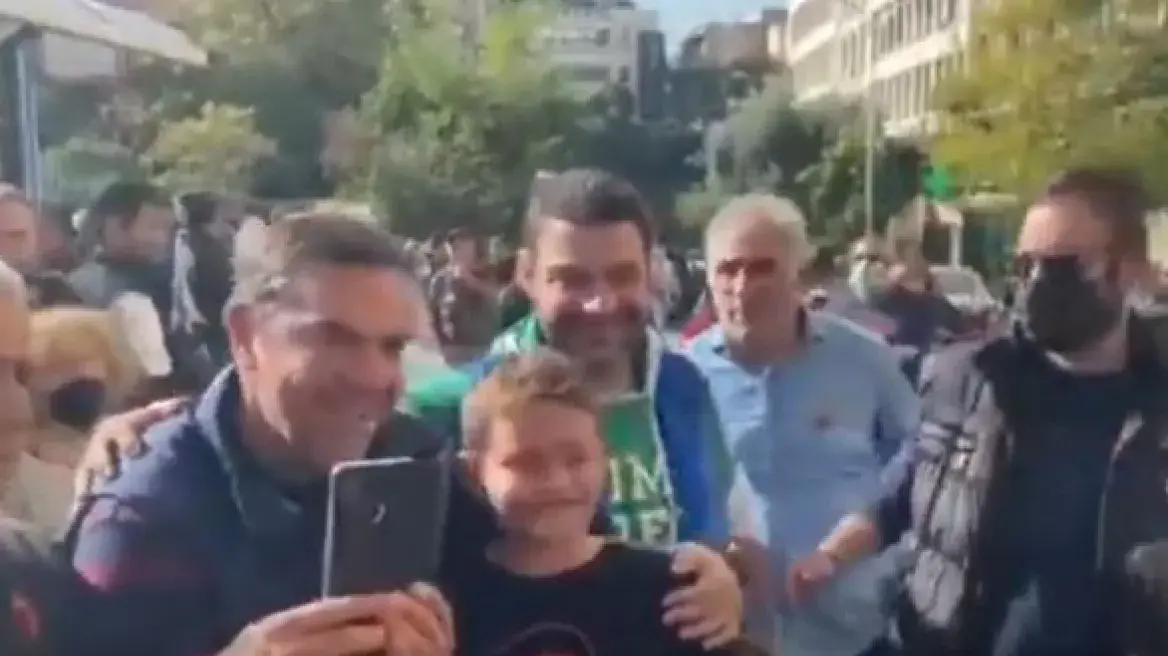 Ο κ. Τσίπρας συνομίλησε με διαδηλωτές που τον υποδέχθηκαν με αγκαλιές στην οδό Σταδίου όπου είχε δοθεί το ραντεβού της προσυγκέντρωσης των μελών του ΣΥΡΙΖΑ. Ο πρόεδρος του ΣΥΡΙΖΑ έκανε, μάλιστα, μια στάση για έναν μικρό του φίλο, ο οποίος φορούσε μπλούζα με τον Τσε Γκεβάρα.
