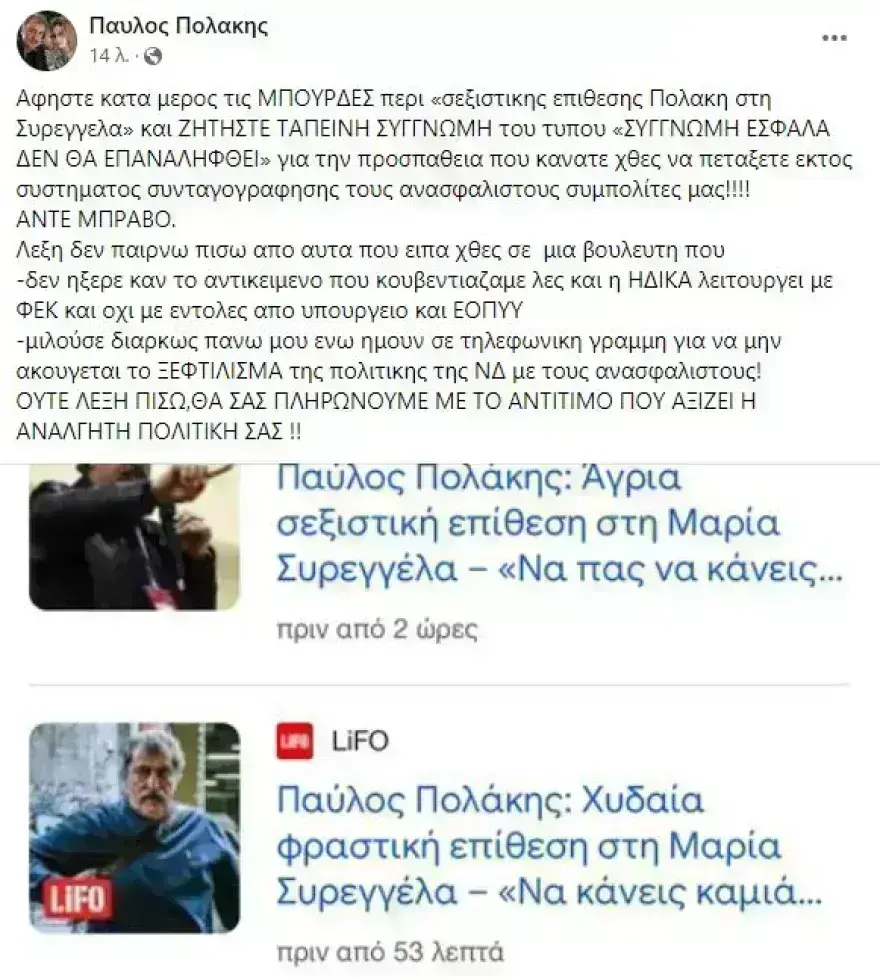 «Λέξη δεν παίρνω πίσω από αυτά που είπα χθες» αναφέρει στην ανάρτησή του ο Παύλος Πολάκης και διαμηνύει ότι δεν θα πει καμία «συγγνώμη, έσφαλα, δεν θα επαναληφθεί». «Αφήστε κατά μέρος τις ΜΠΟΥΡΔΕΣ περί “σεξιστικής επίθεσης Πολάκη στη Συρεγγέλα” και ΖΗΤΗΣΤΕ ΤΑΠΕΙΝΗ ΣΥΓΓΝΩΜΗ του τύπου “ΣΥΓΓΝΩΜΗ ΕΣΦΑΛΑ ΔΕΝ ΘΑ ΕΠΑΝΑΛΗΦΘΕΙ” για την προσπάθεια που κάνατε χθες να πετάξετε εκτός συστήματος συνταγογράφησης τους ανασφάλιστους συμπολίτες μας!