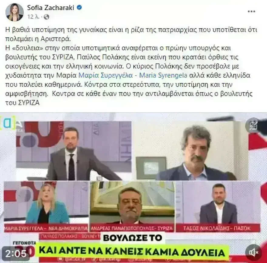 «Η βαθιά υποτίμηση της γυναίκας είναι η ρίζα της πατριαρχίας που υποτίθεται ότι πολεμάει η Αριστερά. Η «δουλεια» στην οποία υποτιμητικά αναφέρεται ο πρώην υπουργός και βουλευτής του ΣΥΡΙΖΑ, Παύλος Πολάκης είναι εκείνη που κρατάει όρθιες τις οικογένειες και την ελληνική κοινωνία. Ο κύριος Πολάκης δεν προσέβαλε με χυδαιότητα την Μαρία Μαρία Συρεγγέλα – Maria Syrengela αλλά κάθε ελληνίδα που παλεύει καθημερινά. Κόντρα στα στερεότυπα, την υποτίμηση και την αμφισβήτηση. Κοντρα σε κάθε έναν που την αντιλαμβάνεται όπως ο βουλευτής του ΣΥΡΙΖΑ»