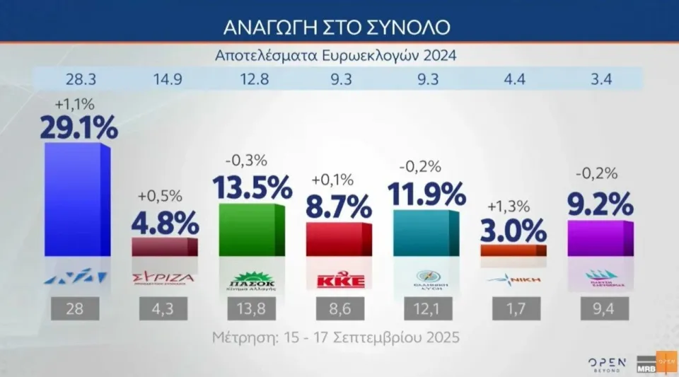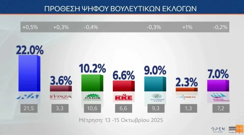 H Νέα Δημοκρατία διατηρεί την πρώτη θέση με 22% καταγράφοντας διπλάσια διαφορά από το ΠΑΣΟΚ που ακολουθεί με 10,2% σύμφωνα με τη σδημοσκόπηση που παρουσιάστηκε στο OPEN. Στην τρίτη θέση βρίσκεται πλέον η Ελληνική Λύση με 9%, στην τέταρτη ακολουθεί η Πλεύση Ελευθερίας και στη συνέχεια το ΚΚΕ με 6,6%. Ο ΣΥΡΙΖΑ, δε, φαίνεται πως οριακά περνά το κατώφλι της Βουλής με 3,6%.