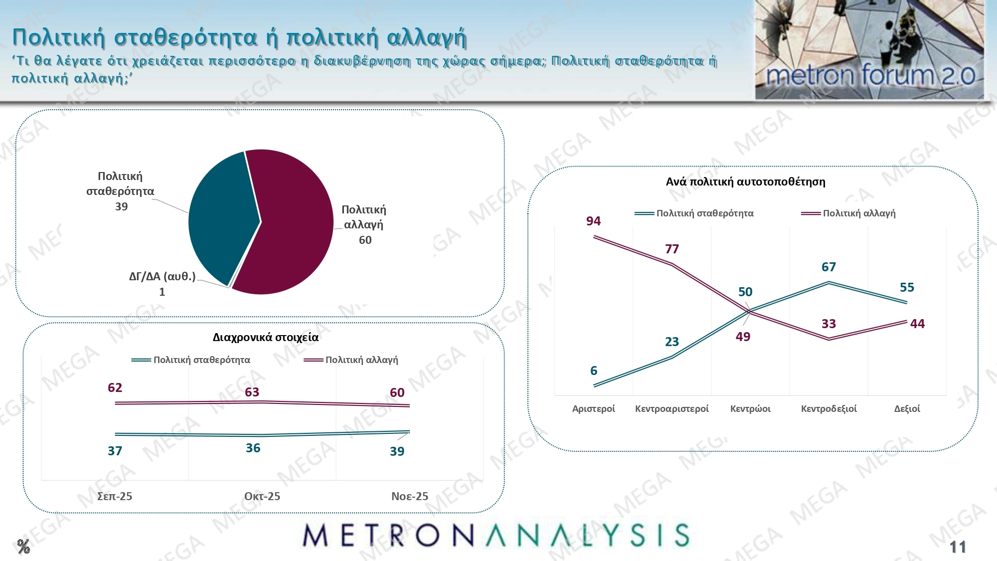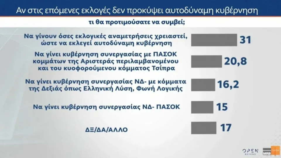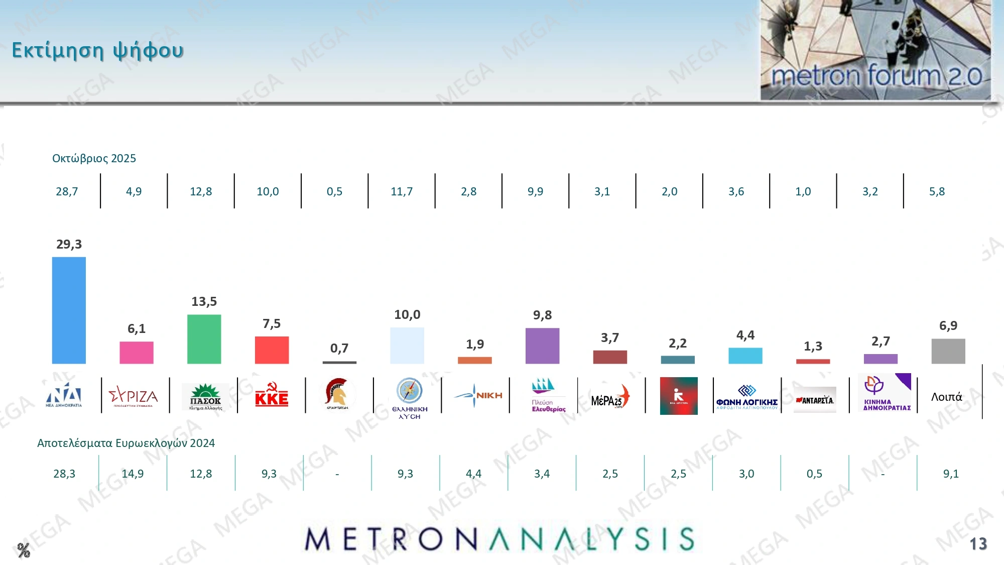 Η εκτίμηση ψήφου της δημοσκόπησης του MEGA δίνει άνοδο της Νέας Δημοκρατίας στο 29,3%. Ο ΣΥΡΙΖΑ καταγράφει άνοδο στο 6,1% όπως και το ΠΑΣΟΚ στο 13,5%. Το ΚΚΕ υποχωρεί στο 7.5%, η Ελληνική Λύση στο 10% και η Πλεύση Ελευθερίας διατηρεί τις δυνάμεις της. Ανοδική τάση καταγράφουν ακόμη το ΜέΡΑ25 και η Φωνή Λογικής, ενώ η Νέα Αριστερά εξακολουθεί να απέχει πολύ από το όριο του 3%.