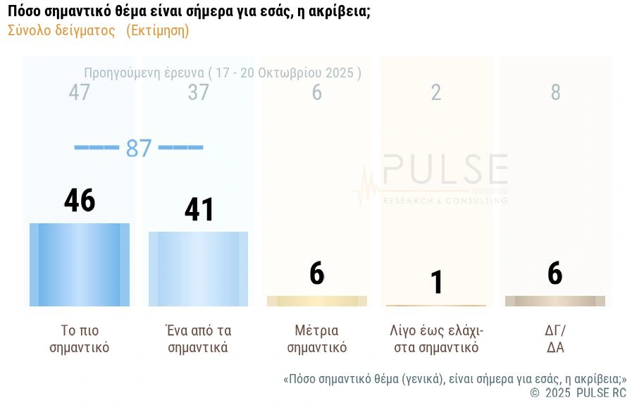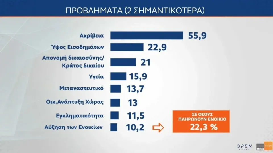 Η ακρίβεια παραμένει το βασικό πρόβλημα για τους πολίτες, καταγράφοντας το συντριπτικό 55,9%.