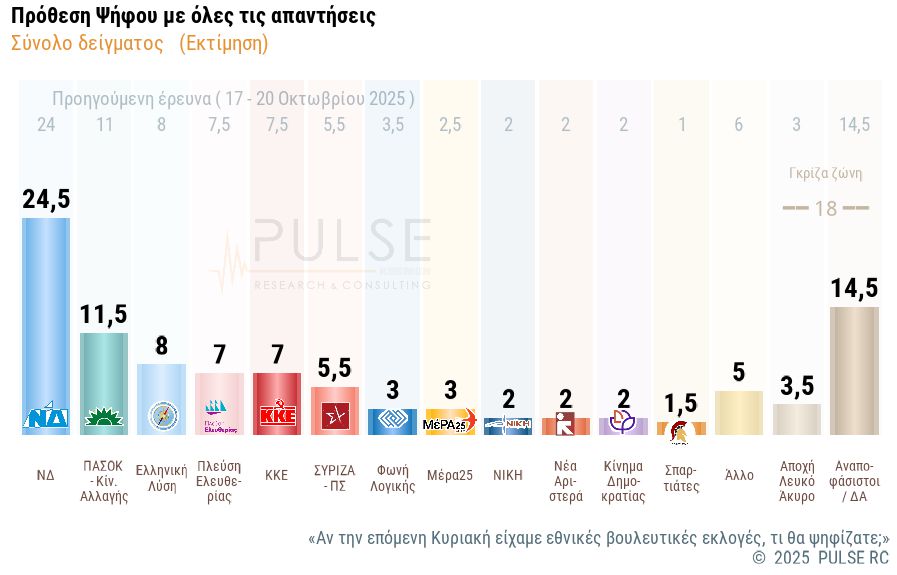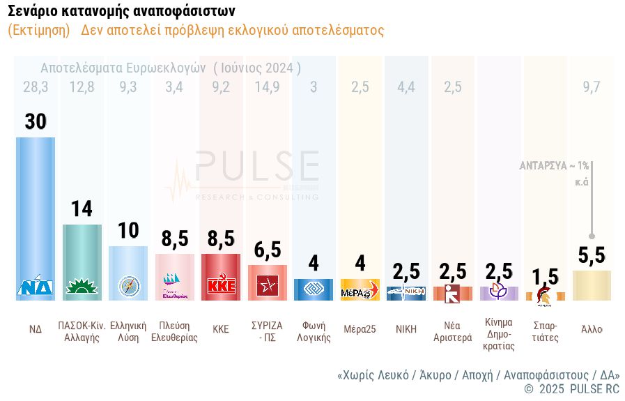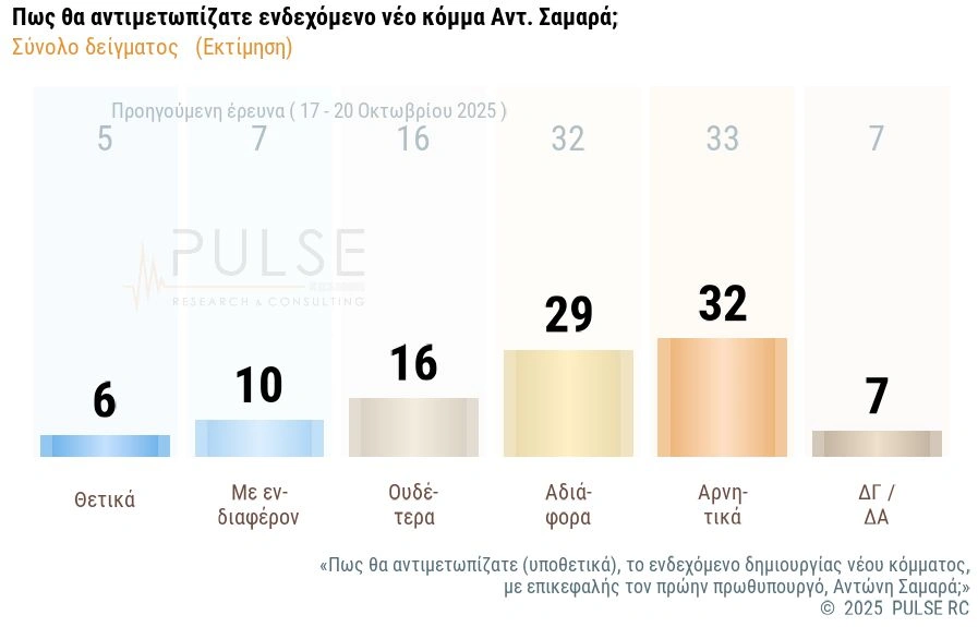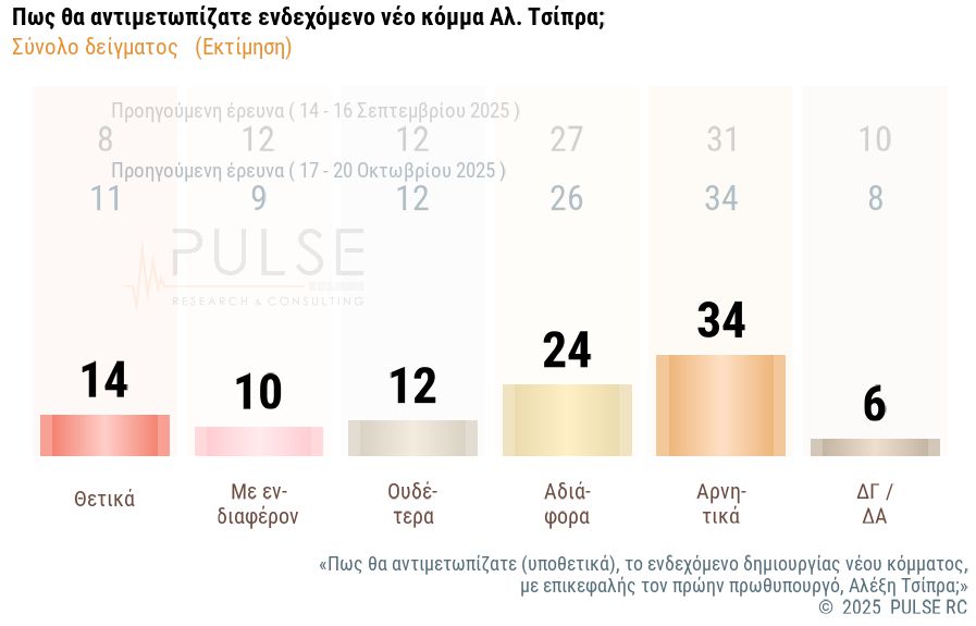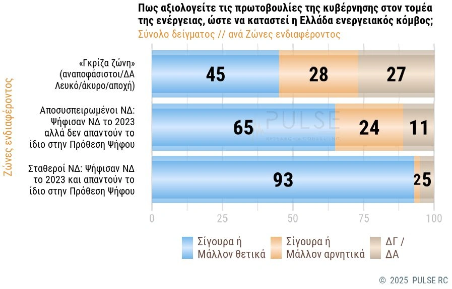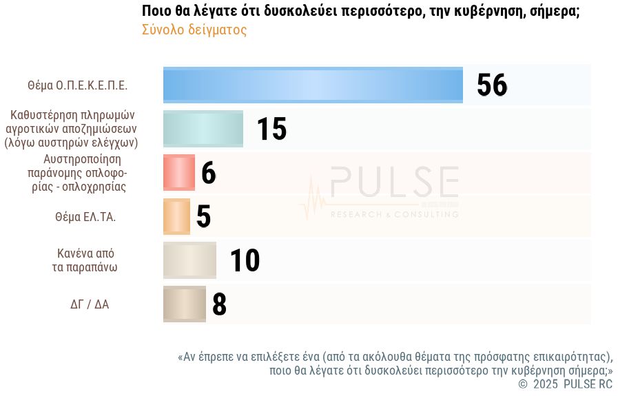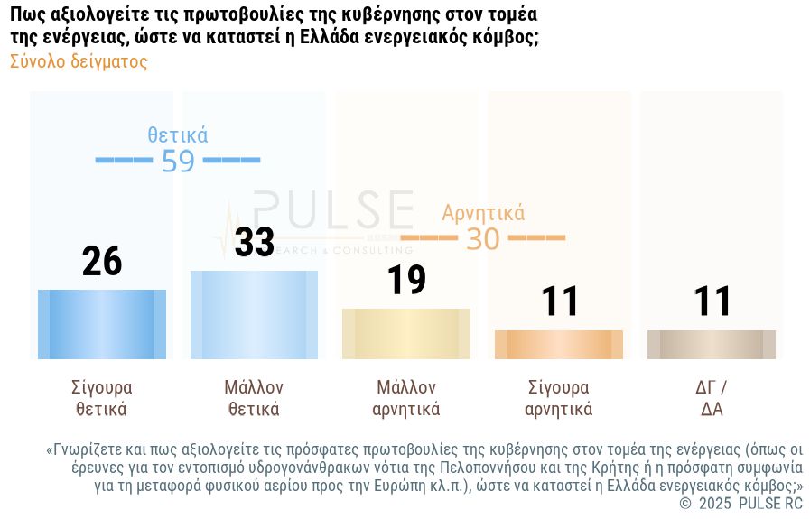 Θετικό είναι το αποτύπωμα από τις κινήσεις της κυβέρνησης στα ενεργειακά, όπως αποτυπώνεται στη δημοσκόπηση της Pulse, η οποία παρουσιάστηκε στο κεντρικό δελτίο του ΣΚΑΙ. Όσον αφορά στην εκτίμηση ψήφου, η Νέα Δημοκρατία διατηρεί τη διαφορά των 16 μονάδων, παρουσιάζοντας ποσοστό 30%, με το ΠΑΣΟΚ να ακολουθεί με 14%. Ενδιαφέρον επίσης παρουσιάζει η πρόθεση ψήφου στο κόμμα που πιθανόν να ιδρύσει ή στην κίνηση του πρώην πρωθυπουργού Αλέξη Τσίπρα, αυξάνοντας το ποσοστό στο 24%. Αυξητική τάση παρουσιάζει και το κόμμα που πιθανόν να ιδρύσει ο επίσης πρώην πρωθυπουργός Αντώνης Σαμαράς. Η ακρίβεια δείχνει να παραμένει στην πρώτη θέση των προβλημάτων που απασχολούν τους Έλληνες πολίτες, καθώς το κόστος ζωής συνεχίζει να αυξάνεται. Η δημοσκόπηση της Pulse έδειξε επίσης ότι οι πολίτες θεωρούν σε ποσοστό 56% πως η κυβέρνηση αντιμετωπίζει δυσκολίες στο θέμα του ΟΠΕΚΕΠΕ, το οποίο βέβαια, συνδέεται με το 15% των καθυστερήσεων στις πληρωμές των αγροτών.