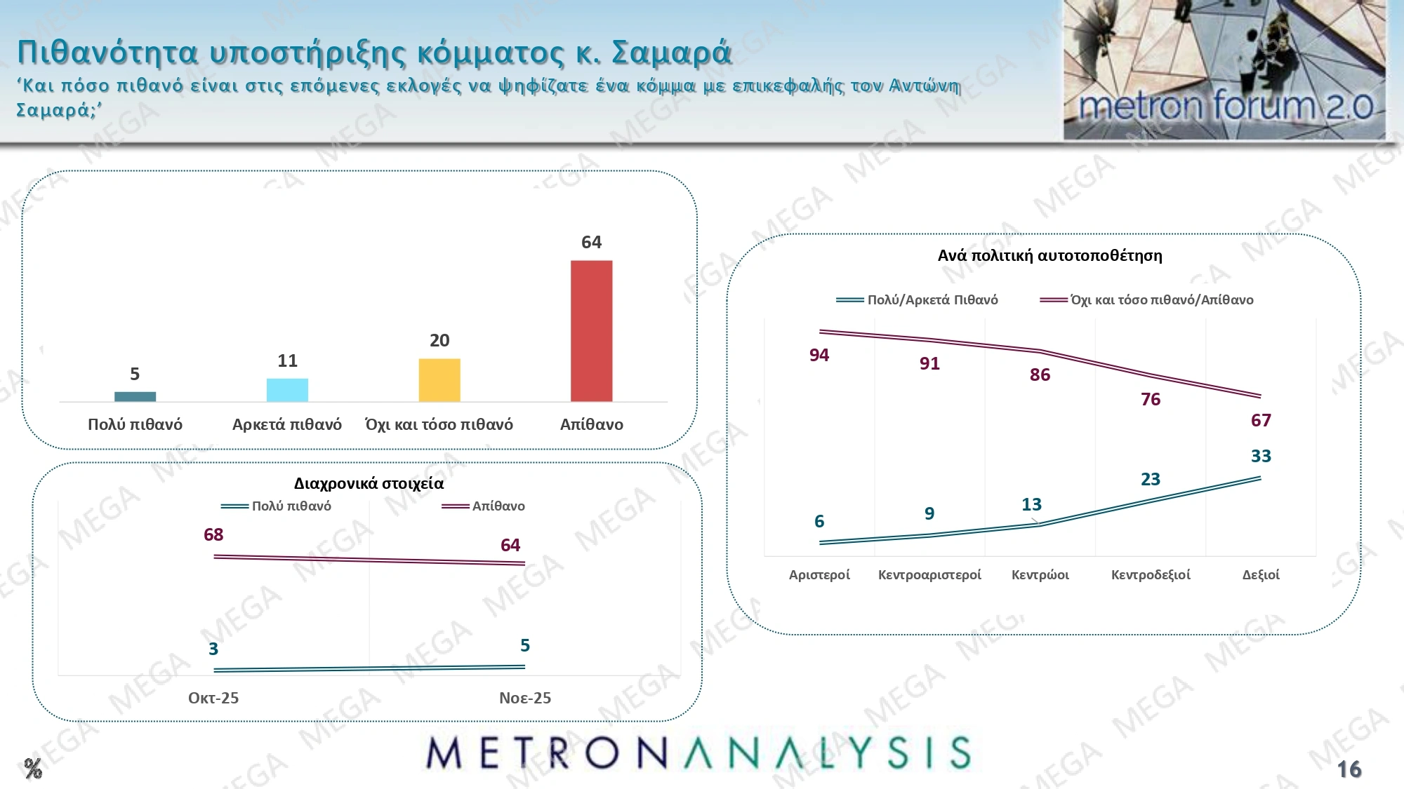 Η Metron Analysis ρώτησε μεταξύ άλλων τη γνώμη των πολιτών για τον πρώην πρωθυπουργό Αλέξη Τσίπρα. Ο πρώην αρχηγός του ΣΥΡΙΖΑ, λαμβάνει ποσοστό 6% στην ερώτηση για τον καταλληλότερο πρωθυπουργό. Επιπλέον, στην ερώτηση «αν θα ψηφίζατε στις επόμενες εκλογές ένα κόμμα με επικεφαλής τον Αλέξη Τσίπρα», οι πολίτες απάντησαν ως εξής: