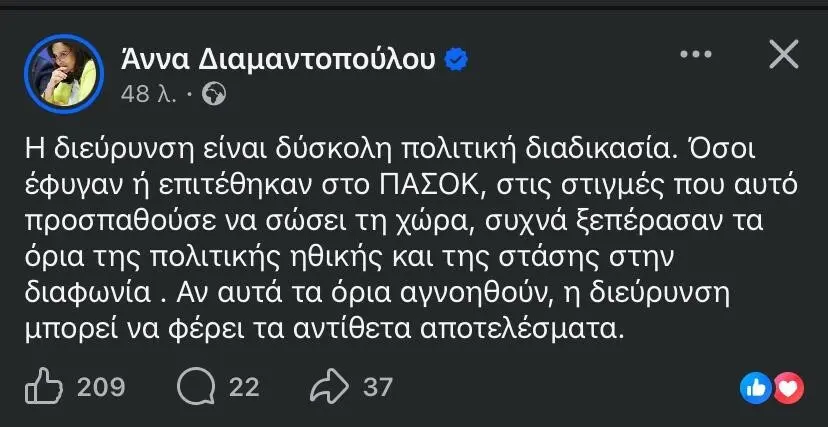 Θυμίζουμε με ανάρτησή της το πρωί της Τρίτης, η Άννα Διαμαντοπούλου αναφέρει η ίδια πλέον: «Η διεύρυνση είναι δύσκολη πολιτική διαδικασία. Όσοι έφυγαν ή επιτέθηκαν στο ΠΑΣΟΚ, στις στιγμές που αυτό προσπαθούσε να σώσει τη χώρα, συχνά ξεπέρασαν τα όρια της πολιτικής ηθικής και της στάσης στη διαφωνία. Αν αυτά τα όρια αγνοηθούν, η διεύρυνση μπορεί να φέρει τα αντίθετα αποτελέσματα».