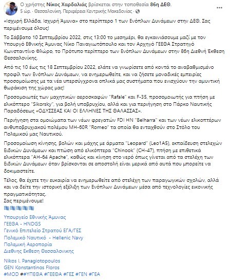 «Το Σάββατο 10 Σεπτεμβρίου 2022, στις 13:00 το μεσημέρι, θα εγκαινιάσουμε μαζί με τον υπουργό Εθνικής ‘Αμυνας Νίκο Παναγιωτόπουλο και τον αρχηγό ΓΕΕΘΑ στρατηγό Κωνσταντίνο Φλώρο, το πρότυπο περίπτερο των Ενόπλων Δυνάμεων στην 86η Διεθνή Έκθεση Θεσσαλονίκης» προσθέτει ο Ν. Χαρδαλιάς.