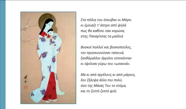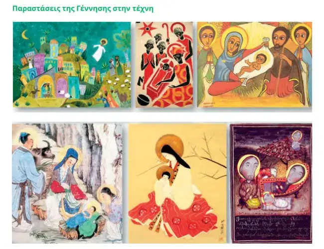 Στη σελίδα 56 του βιβλίου Θρησκευτικών της Γ’ Δημοτικού, οι μαθητές συναντούν τις δύο απεικονίσεις της Παναγίας, στην ενότητα για τη γιορτή των Χριστουγέννων και της Πρωτοχρονιάς.
