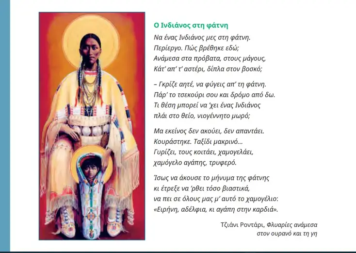Ειδικότερα, για την «Παναγία την Ινδιάνα», το βιβλίο συνοδεύει τον πίνακα με ένα υπέροχο ποίημα του Τζιάνι Ροντάρι «Φλυαρίες ανάμεσα στον ουρανό και τη γη», το οποίο λέει: