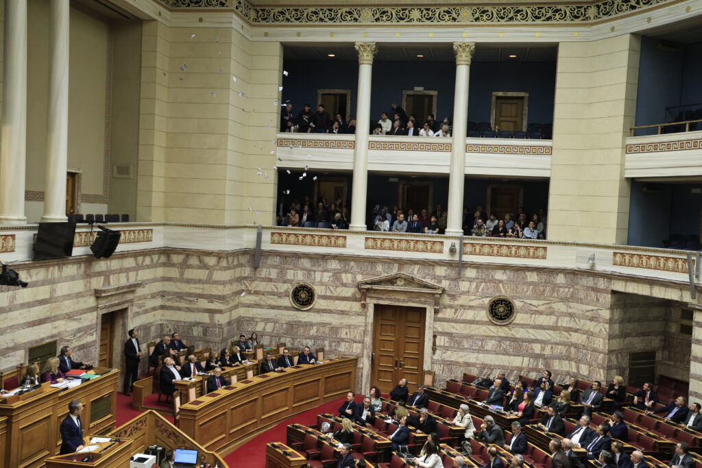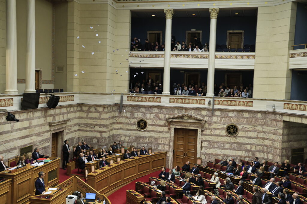 Ομάδα ατόμων που βρήκε πρόσβαση στην αίθουσα της Ολομέλειας της Βουλής πέταξε φέιγ βολάν όταν στο βήμα ανέβηκε ο Κυριάκος Μητσοτάκης.