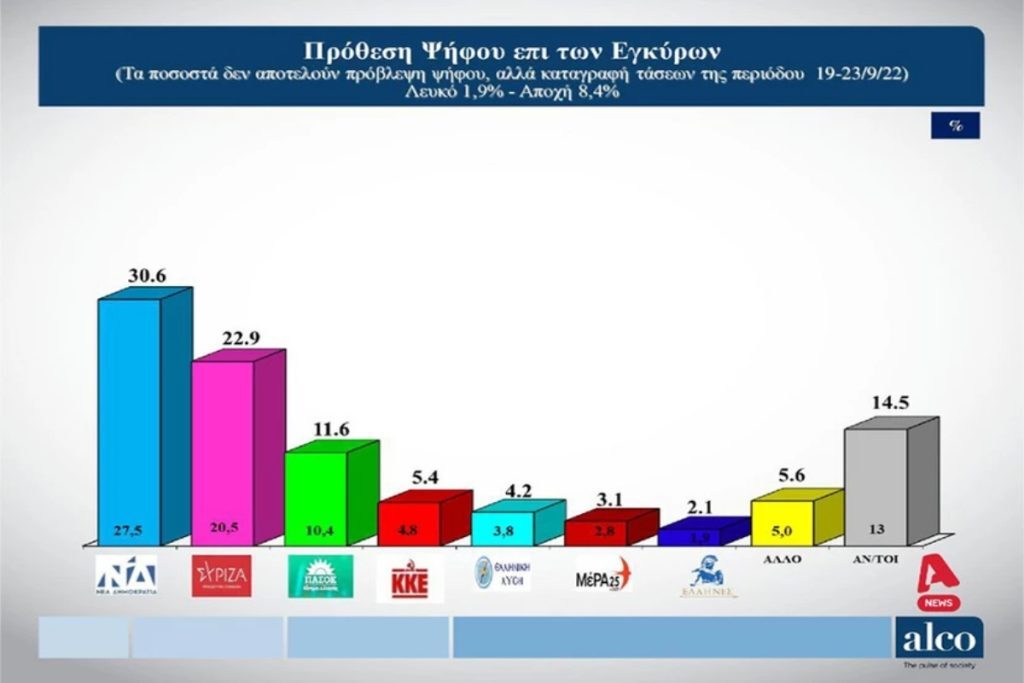 Δημοσκόπηση Alco: Η διαφορά της Νέας Δημοκρατίας από τον ΣΥΡΙΖΑ βρίσκεται στις 7,7 μονάδες