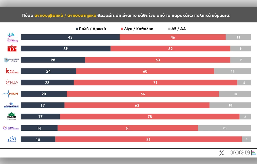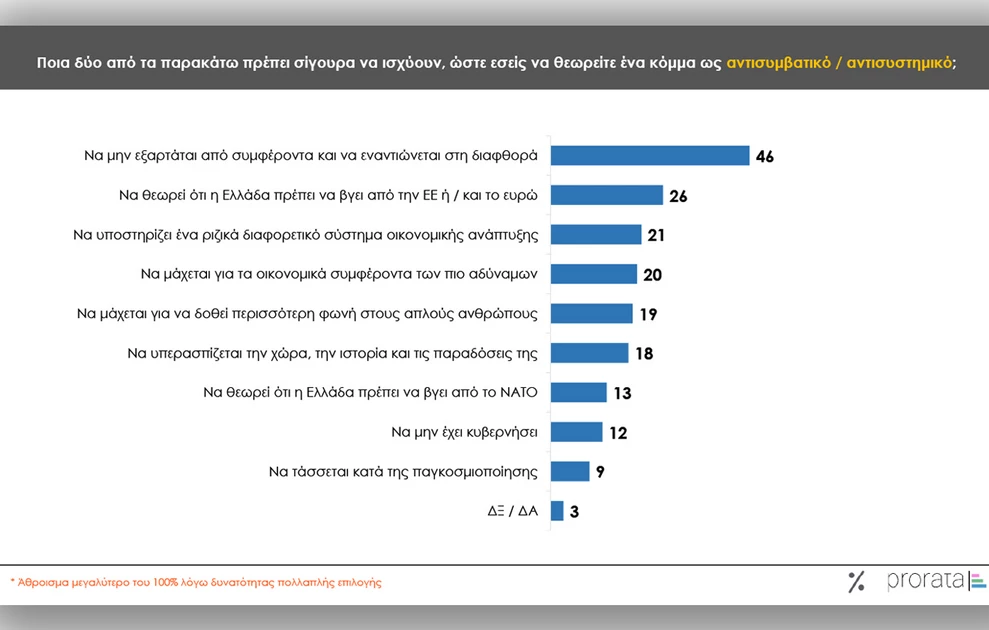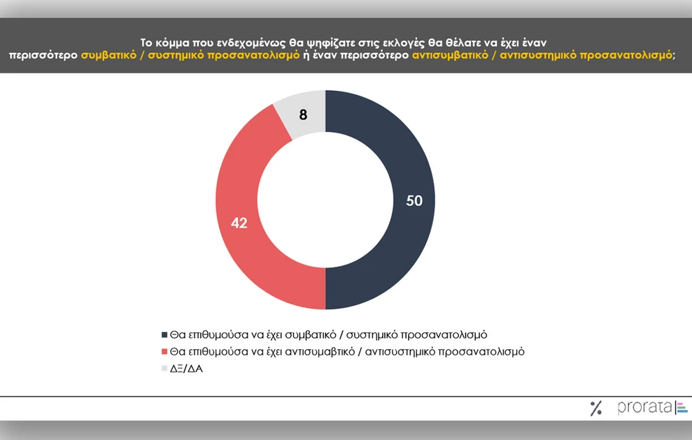 Στο ερώτημα, μάλιστα, εάν το κόμμα που θα επιλέξουν επιθυμούν να έχει συμβατικό / συστημικό προσανατολισμό ή αντισυστημικό, το 50% των ερωτηθέντων απαντά ότι θα επιλέξει συστημικές πολιτικές δυνάμεις, ισχυρό είναι ωστόσο το μερίδιο των αντισυστημικών που σκαρφαλώνει στο 42%.