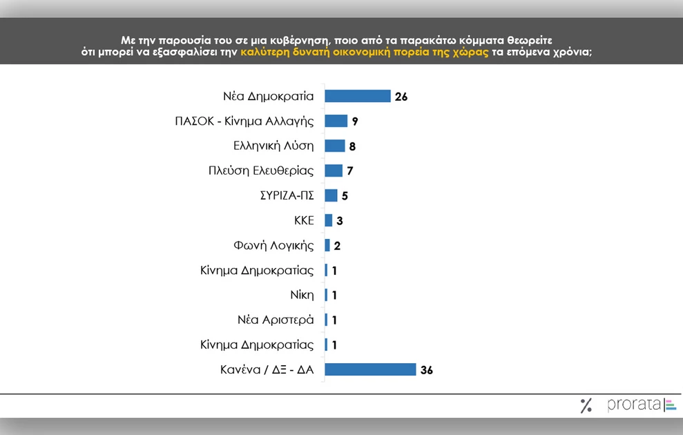 Τέλος, στο ερώτημα «Ποιο κόμμα πιστεύετε ότι μπορεί να δώσει τις πιο ρεαλιστικές λύσεις στα προβλήματα των πολιτών;», οι πολίτες συνεχίζουν να εμπιστεύονται τη ΝΔ κατά 29,8% (ποσοστό κοντά στην πρόβλεψη αποτελέσματος), ενώ η Πλεύση Ελευθερίας, από το 17,9% στην πρόβλεψη αποτελέσματος, κατακρημνίζεται στο 9,8%. Ομως τόσο το ΠΑΣΟΚ όσο και ο ΣΥΡΙΖΑ σε αυτή την ερώτηση παραμένουν περίπου στα ίδια ποσοστά με αυτά της πρόβλεψης αποτελέσματος.