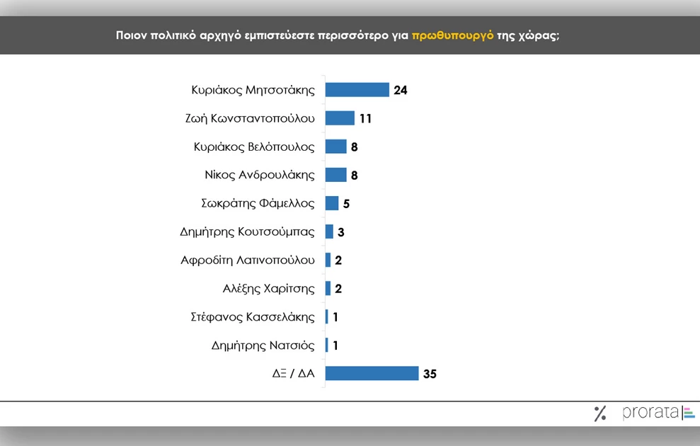 Ακολουθούν Ζωή Κωνσταντοπούλου 11% , Νίκος Ανδρουλάκης 8,6%, Κυριάκος Βελόπουλος 6,9%, Δημήτρης Κουτσούμπας 6,1%, Σωκράτης Φάμελλος 4,1%, Στέφανος Κασσελάκης 3%, Δημήτρης Νατσιός 2%, Βασίλης Στίγκας 1,5%, Αλέξης Χαρίτσης 1%.