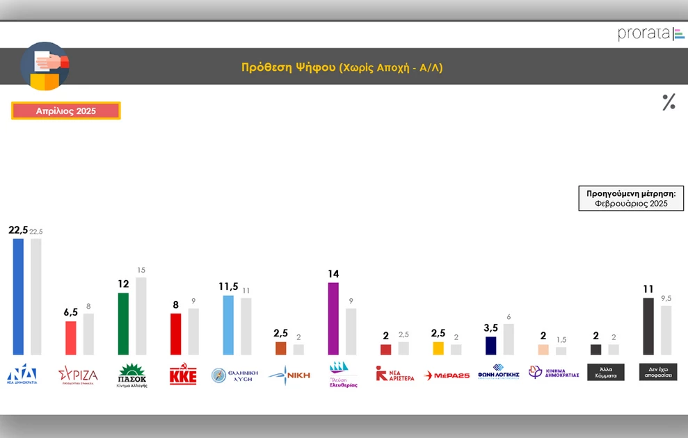 Η νέα μεγάλη δημοσκόπηση της Prorata για το ATTICA TV δείχνει την Πλεύση Ελευθερίας να καθιερώνεται στη δεύτερη θέση, με τη δεξαμενή των ψηφοφόρων της να επεκτείνεται και σε άλλα κόμματα. Σύμφωνα με την πρόθεση ψήφου, η ΝΔ διατηρεί την πρωτιά με 22,5% και δεύτερη είναι η παράταξη της Ζωής Κωνσταντοπούλου με 14%. Τρίτο έρχεται το ΠΑΣΟΚ με 12%, ενώ σε στενή απόσταση ακολουθεί η Ελληνική Λύση με 11,5%.