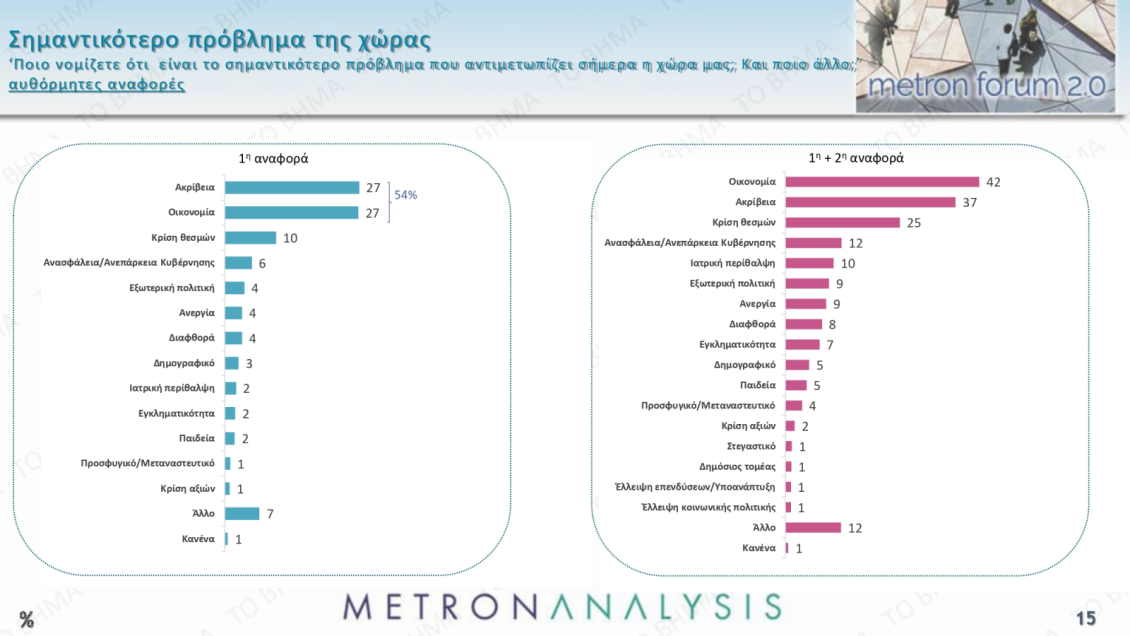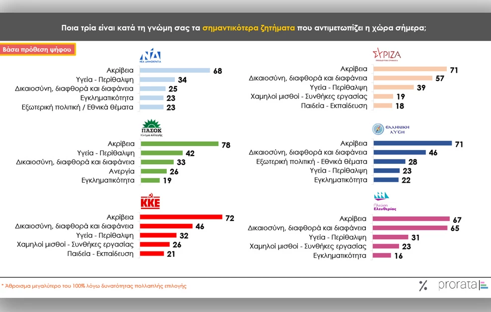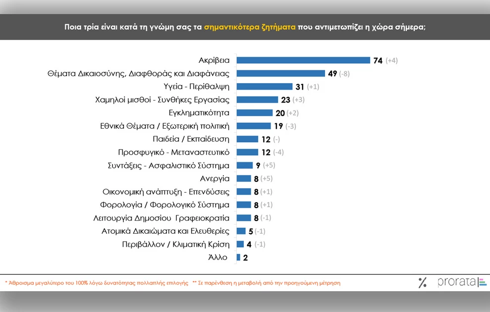 Η ανησυχία των πολιτών για την Ακρίβεια δείχνει να αυξάνεται και φθάνει στο 27% από το 24% τον προηγούμενο μήνα. Ακολουθεί η Οικονομία επίσης με 27% και η κρίση των Θεσμών στο οποίο εντάσσεται και το θέμα των Τεμπών πέφτει στο 10% από το 17% που ήταν τον Μάρτιο.