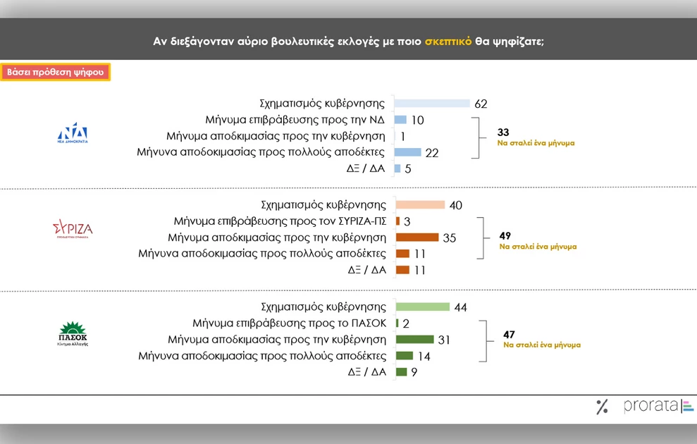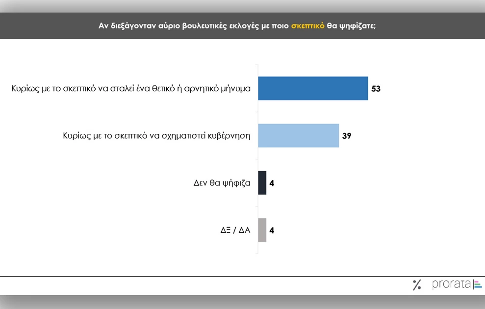 Αξιοσημείωτο εύρημα της έρευνας, που εξηγεί έως ένα βαθμό την ενίσχυση συνολικά των αντισυστημικών κομμάτων, είναι ότι στο ερώτημα «με ποιο σκεπτικό θα ψηφίζατε εάν διεξάγονταν αύριο εκλογές, το 53% δηλώνει ότι θα προσέλθει στην κάλπη για να στείλει μήνυμα και μόνο το 39% για να σχηματιστεί κυβέρνηση.