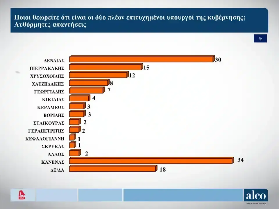 Στην πανελλαδική έρευνα της Alco, ο πλέον επιτυχημένος υπουργός παραμένει ο Νίκος Δένδιας με ποσοστό 30%. Ακολουθεί ο υπ. Παιδείας Κυριάκος Πιερρακάκης με 15%, και την τριάδα συμπληρώνει ο υπ. Προστασίας του Πολίτη Μιχάλης Χρυσοχοΐδης με 12%.