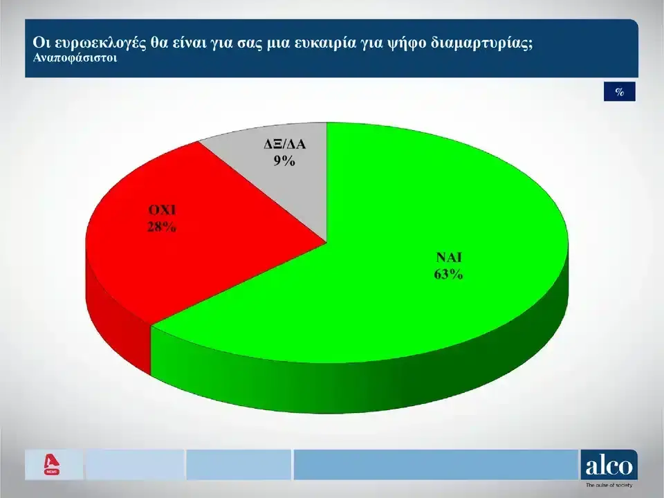 Στη χορεία των αναποφάσιστων το ποσοστό που εκτιμά ότι οι ευρωεκλογές θα είναι μια ευκαιρία διαμαρτυρίας, ανεβαίνει στο 63%.