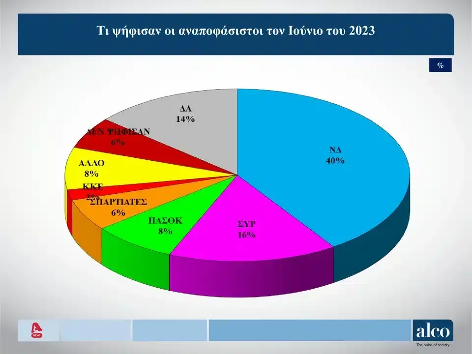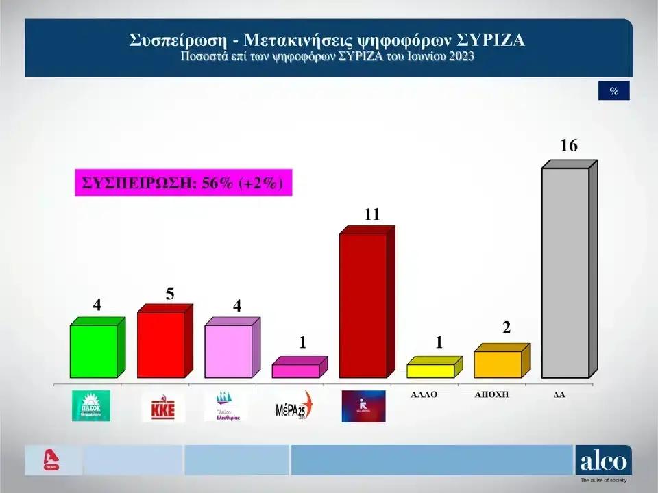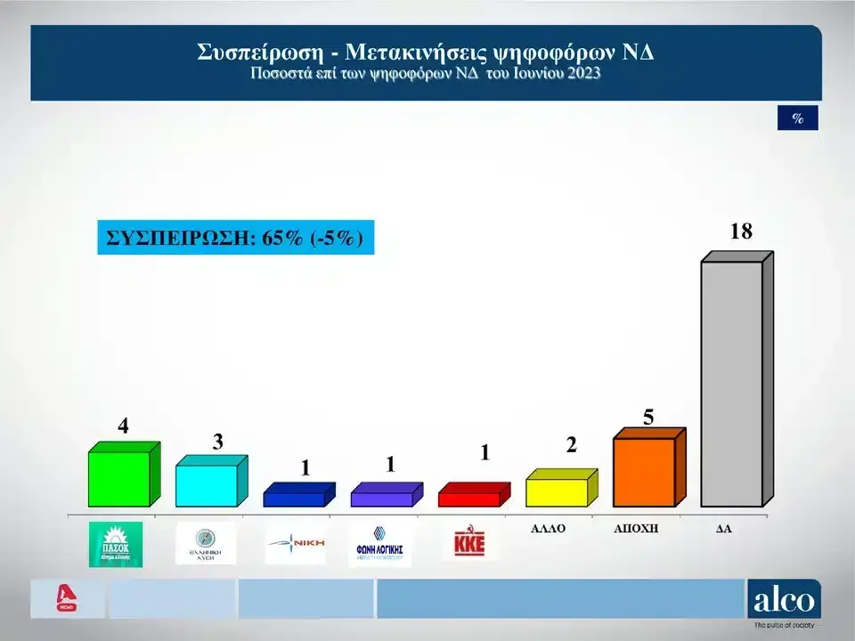 Στην έρευνα της Alco η συσπείρωση της ΝΔ μειώνεται κατά 5 μονάδες και βρίσκεται στο 64%. Αναποφάσιστοι εμφανίζεται ένα ποσοστό της τάξης του 15% ενώ σε αποχή προσνατολίζεται το 5%.