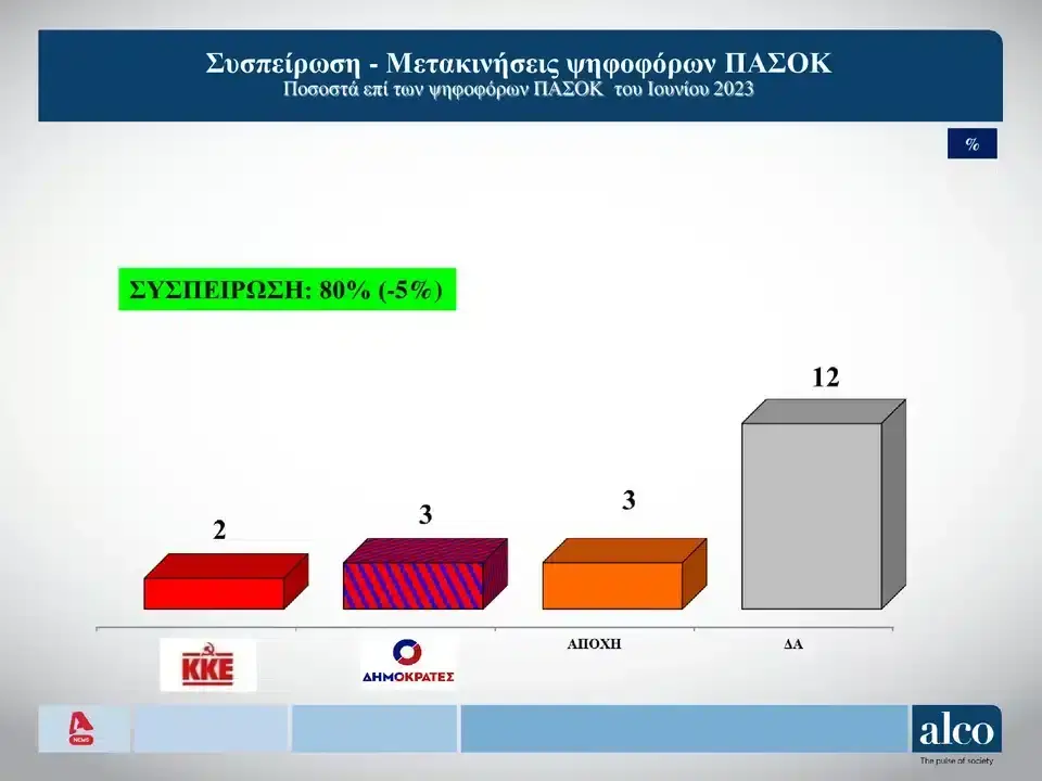 Το ΠΑΣΟΚ χάνει επίσης 5 μονάδες συπσπείρωσης και βρίσκεται στο 80%, ενώ 12% δηλώνουν ότι δεν γνωρίζουν. Ένα 3% πηγαίνει στο νεοσύστατο κόμμα του Ανδρέα Λοβέρδου, «Δημοκράτες», ένα 3% ακόμη πάει προς την αποχή και το 2% στο ΚΚΕ.