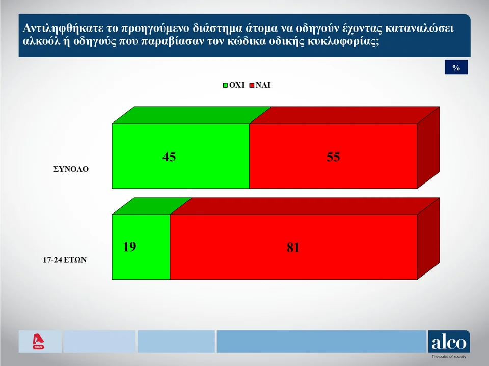 Στο ζήτημα των τροχαίων και των οδηγών που παραβιάζον τον Κώδικα Οδικής Κυκλοφορίας, πάνω από τους μισούς (συγκεκριμένα το 55%), λέει πως το προηγούμενο διάστημα έχει δει οδηγούς να κυκλοφορούν έχοντας καταναλώσει αλκοόλ. Στις ηλικίες 17-24 ετών, το ποσοστό είναι τρομακτικά μεγάλο, καθώς 8 στους 10 παραδέχεται πως έχει δει μεθυσμένους να οδηγούν. Για το αν πρέπει να γίνουν πιο αυστηρές οι πονές σε όσους οδηγούν έχοντας καταναλώσει αλκοόλ, ή οδηγούν χωρίς δίπλωμα ή επικίνδυνα, οι 9 στους 10 λένε πως «ναι».