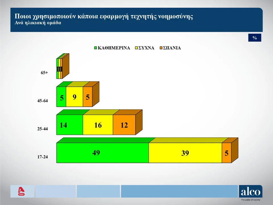 Τέλος, με την τεχνική νοημοσύνη να έχει μπει στη ζωή μας, οι ερωτηθέντες απάντησαν στο αν χρησιμοποιούν κάποια εφαρμογή ΑΙ. Ενας στους δύο νέους, ηλικίας 17-24 ετών, λέει πως χρησιμοποιεί καθημερινά (49%), ενώ το 39% λέει «συχνά» Οσο μεγαλώνει το ηλικιακό επίπεδο, τα ποσοστά είναι και πιο μικρά.