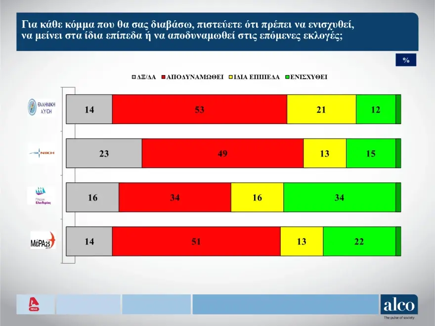 Αναλυτικά, στην πρόθεση ψήφου επί των έγκυρων τα κόμματα συγκεντρώνουν τα εξής ποσοστά: