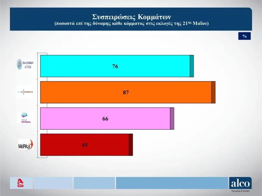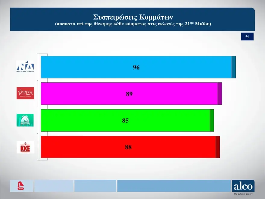 Τεράστιο ποσοστό συσπείρωσης καταγράφει η Νέα Δημοκρατία με 96%, ακολουθεί ο ΣΥΡΙΖΑ με 89%, το ΚΚΕ με 88%, η Νίκη με 87%, το ΠΑΣΟΚ με 85%. Αρκετά πιο χαμηλά από τα κόμμα αυτά βρίσκονται η Ελληνική Λύση με 76%, η Πλεύση Ελευθερίας με 66% και το ΜέΡΑ25 με 45%.