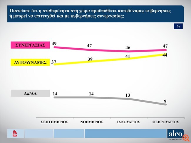 Σε άλλα ερωτήματα της έρευνας οι πολίτες εμφανίζονται μοιρασμένοι απέναντι στα ενδεχόμενα σχηματισμού κυβέρνησης συνεργασίας ή αυτοδύναμης κυβέρνησης. Ελαφρύ προβάδισμα διατηρεί η συνεργασία κομμάτων με 47% έναντι 44% που θα προτιμούσε αυτοδυναμία κάποιου κόμματος.