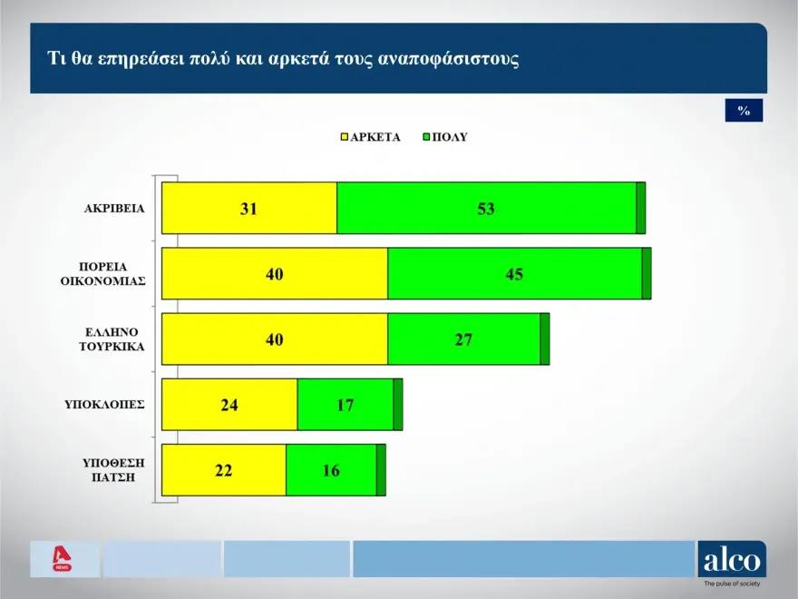 Εχει ενδιαφέρον ότι οι αναποφάσιστοι – που σύμφωνα με την ALCO αποτελούν αυτή την περίοδο το 14,2% του εκλογικού σώματος – δηλώνουν ότι την ψήφο τους θα καθορίσει σε μεγάλο βαθμό η πορεία της οικονομίας και η ακρίβεια, όπως και τα ελληνοτουρκικά, αλλά και οι υποκλοπές. Ανάλογες είναι οι απαντήσεις και στο σύνολο των ψηφοφόρων.