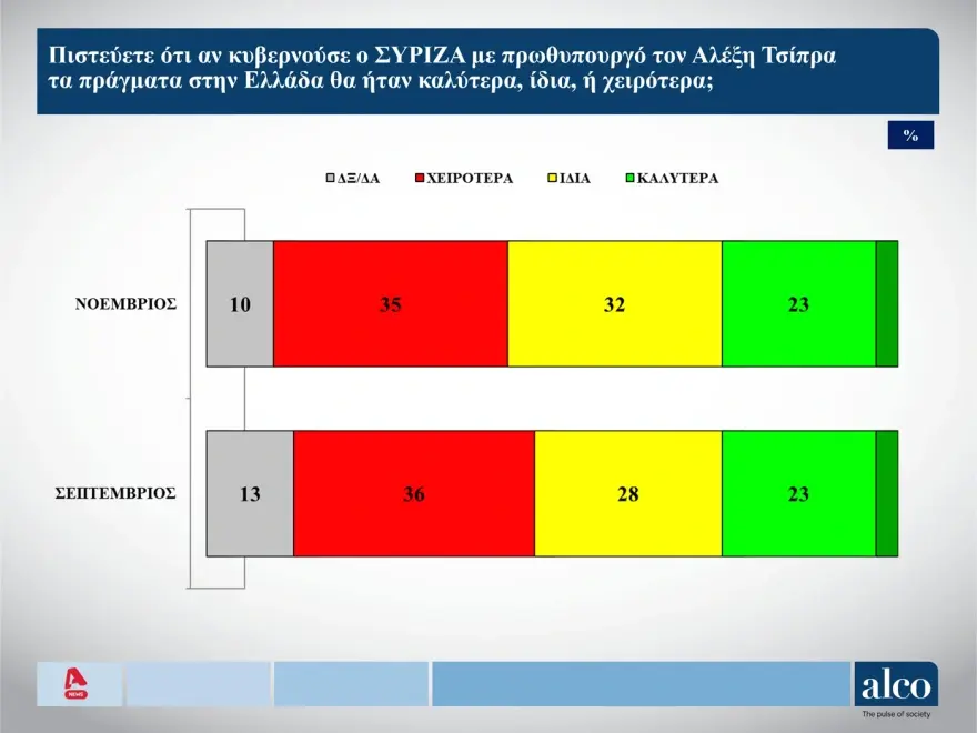 Ενδεικτική της αδυναμίας του ΣΥΡΙΖΑ να «εισπράξει» από την κυβερνητική φθορά είναι και και το γεγονός ότι παραμένει για άλλον ένα μήνα «κολλημένο» στο 23% το ποσοστό εκείνων που δηλώνουν ότι τα πράγματα «θα ήταν καλύτερα» με κυβέρνηση ΣΥΡΙΖΑ.