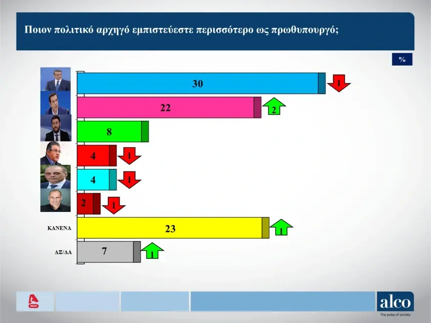 Ο αρχηγός της αξιωματικής αντιπολίτευσης κέρδισε δύο μονάδες σε σχέση με τον Οκτώβριο, ενώ ο πρωθυπουργός έχασε μία. Ωστόσο, ο Αλέξης Τσίπρας μένει πίσω από τον «Κανένα», ενώ ο Νίκος Ανδρουλάκης καταγράφει και πάλι ένα 8% στην συγκεκριμένη ερώτηση.
