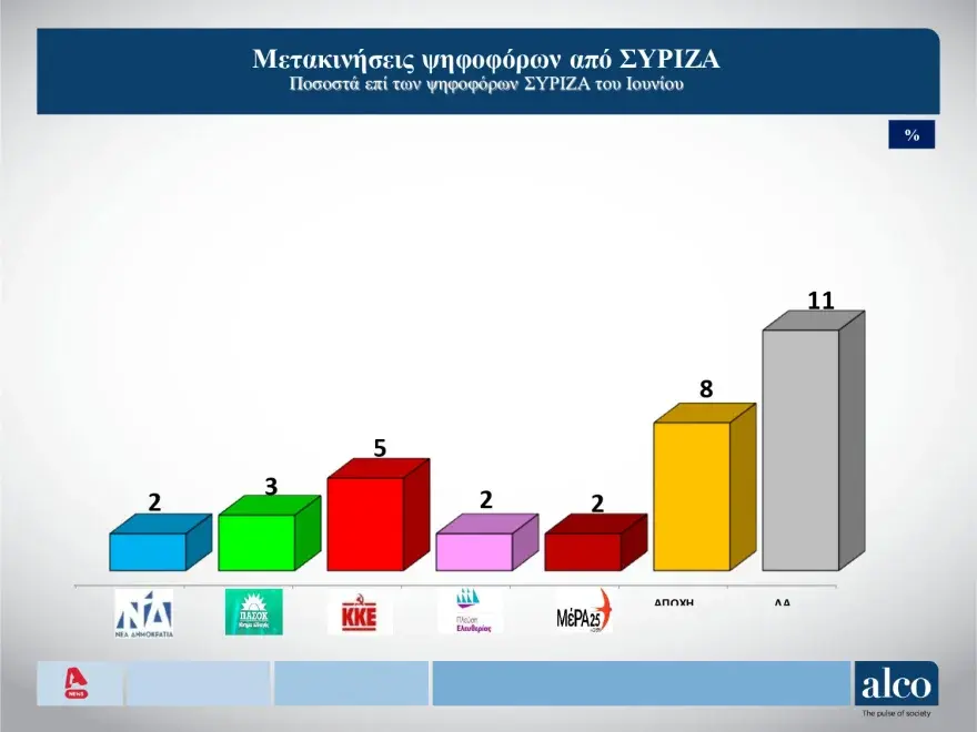 Δημοσκόπηση Alco: 17 μονάδες η διαφορά ΝΔ με ΣΥΡΙΖΑ μετά την εκλογή Κασσελάκη