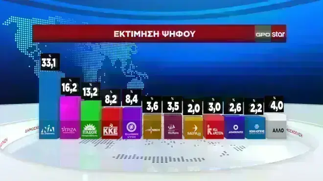 Συγκεκριμένα, στην εκτίμηση ψήφου η ΝΔ συγκεντρώνει 33,1%, ο ΣΥΡΙΖΑ 16,2% και το ΠΑΣΟΚ 13,2%. Ακολουθούν: Ελληνική Λύση 8,4%, ΚΚΕ 8,2%, ΝΙΚΗ 3,6%, Πλεύση Ελευθερίας 3,5%, Νέα Αριστερά 3%, Δημοκράτες 2,6%, Φωνή Λογικής 2,2% και Μέρα25 2%.