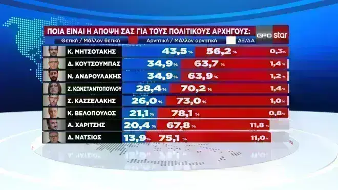 Στις δημοφιλίες των πολιτικών αρχηγών, πρώτος είναι ο Κυριάκος Μητσοτάκης που συγκεντρώνει 43,5% σε θετικές απόψεις. Δεύτερος είναι ο Δημήτρης Κουτσούμπας με 34,9% και ακολουθούν κατά σειρά: Νίκος Ανδρουλάκης, Ζωή Κωνσταντοπούλου, Στέφανος Κασσελάκης, Κυριάκος Βελόπουλος, Αλέξης Χαρίτσης και Δημήτρης Νατσιός.