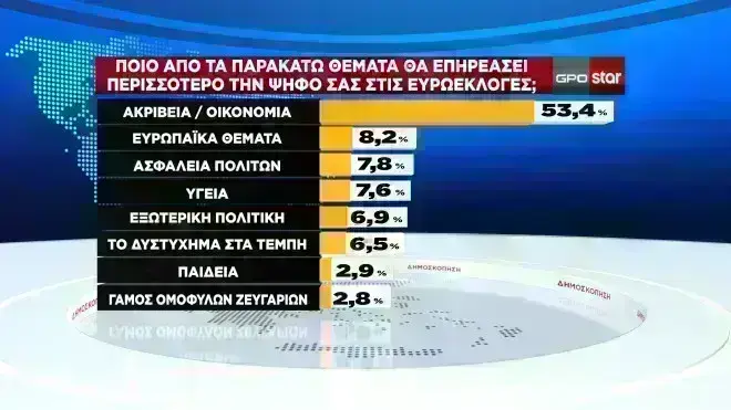Σύμφωνα με τα ευρήματα της έρευνας, περίπου 7 στους 10 θα ψηφίσουν με γνώμωνα τα θέματα που αφορούν το εσωτερικό της χώρας, ενώ μόλις 3 στους 10 τα ευρωπαικά ζητήματα. Παράλληλα, το 44% δηλώνει ότι στις επικείμενες ευρωεκλογές θα ψηφίσει για να δηλώσει την υποστήριξη του προς κάποιο συγκεκριμένο κόμμα, το 28% πως θα ψηφίσει το κόμμα που θεωρεί πως αποτελεί το «λιγότερο κακό», το 8% ότι θα ψηφίσει εκφράζοντας δυσαρέσκεια και παράπονα προς κάποιο συγκεκριμένο κόμμα, ενώ το 17% πως θα ψηφίσει, διαμαρτυρόμενο προς διάφορες κατευθύνσεις.