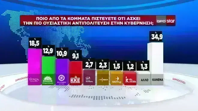 Σύμφωνα με τα ευρήματα της έρευνας, η εκτίμηση εκλογικής επιρροής της Νέας Δημοκρατίας είναι 33.3%, του ΣΥΡΙΖΑ-ΠΣ 12%, του ΠΑΣΟΚ-ΚΙΝΑΛ 13%, του ΚΚΕ 11.2%, της Ελληνικής Λύσης 8.5%, της Νίκης και της Νέας Αριστεράς, αντίστοιχα, 4.5%, ενώ της Πλεύσης Ελευθερίας 3.9%. Ακολουθούν ο Κόσμος και η Φωνή Λογικής με 2.3%, ενώ το άθροισμα των υπολοίπων κομμάτων εκτιμάται στο 4.5%.