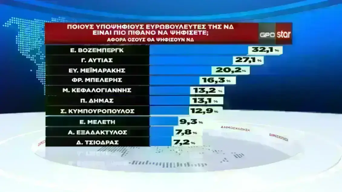 Μεταξύ των υποψήφιων ευρωβουλευτών της ΝΔ, πρώτη στις προτιμήσεις των ερωτηθέντων έρχεται η Ελίζα Βόζεμπεργκ με 32,1%. Και ακολουθούν: Γιώργος Αυτιάς 27,1%. Βαγγέλης Μεϊμαράκης 20,2%, Φρέντης Μπελέρης 16,3%, Μανώλης Κεφαλογιάννης 13,2%, Πύρρος Δήμας 13,1%, Στέλιος Κυμπουρόπουλος 12,9% Ελεονώρα Μελέτη 9,3% ενώ την πρώτη δεκάδα συμπληρώνουν ο Αθανάσιος Εξαδάκτυλος και ο Δημήτρης Τσιόδρας.