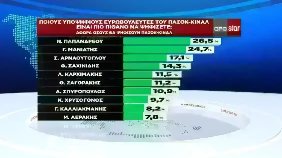 Αντίστοιχα στην πρώτη πεντάδα των υποψηφίων του ΠΑΣΟΚ πρώτος είναι ο Νίκος Παπανδρέου με 26,5%, δεύτερος ο Γιάννης Μανιάτης με 24,7% και ακολουθούν Σάκης Αρναούτογλου, Φίλιππος Σαχινίδης και Λευτέρης Καρχιμάκης.