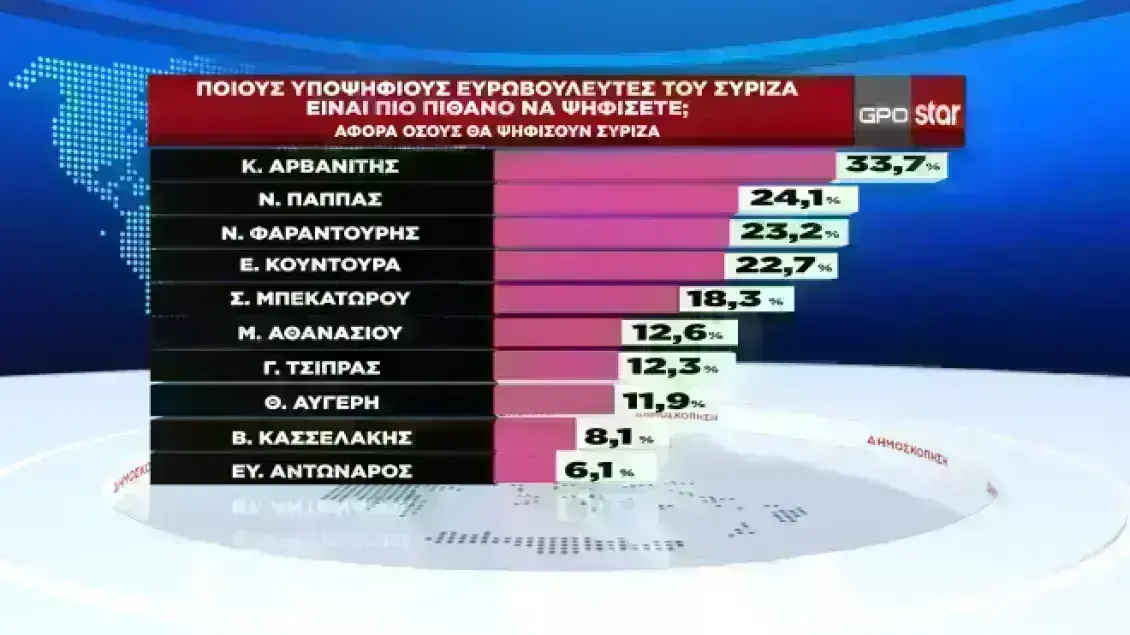 Στην πρώτη πεντάδα των υποψηφίων του ΣΥΡΙΖΑ προηγείται ο Κώστας Αρβανίτης με 33,7% και ακολουθούν: Νίκος Παππάς 24,1%, Νικόλας Φαραντούρης 23,2%, Έλενα Κουντουρά 22,7% και Σοφία Μπεκατώρου 18,3%.