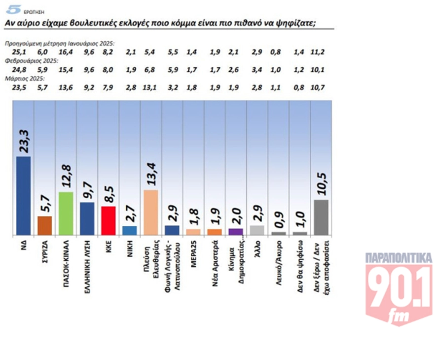 Στην ερώτηση «αν αύριο είχαμε βουλευτικές εκλογές, ποιο κόμμα είναι πιο πιθανό να ψηφίζατε», η Νέα Δημοκρατία συγκεντρώνει ποσοστό 23,3%, η Πλεύση Ελευθερίας ακολουθεί με 13,4%, ενώ το ΠΑΣΟΚ καταγράφει 12,8%. Στην τέταρτη θέση εμφανίζεται η Ελληνική Λύση με 9,7%, το ΚΚΕ έπεται με 8,5%, ενώ ο ΣΥΡΙΖΑ συγκεντρώνει μόλις 5,7%. Ακολουθούν: η Φωνή Λογικής με 2,9%, η Νίκη με 2,7%, το Κίνημα Δημοκρατίας με 2%, η Νέα Αριστερά με 1,9% και το ΜεΡΑ25 με 1,8%.