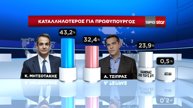 Το 43,2% θεωρεί καταλληλότερο Πρωθυπουργό τον Κ. Μητσοτάκη έναντι 32,4% που θεωρεί καταλληλότερο τον Α. Τσίπρα.