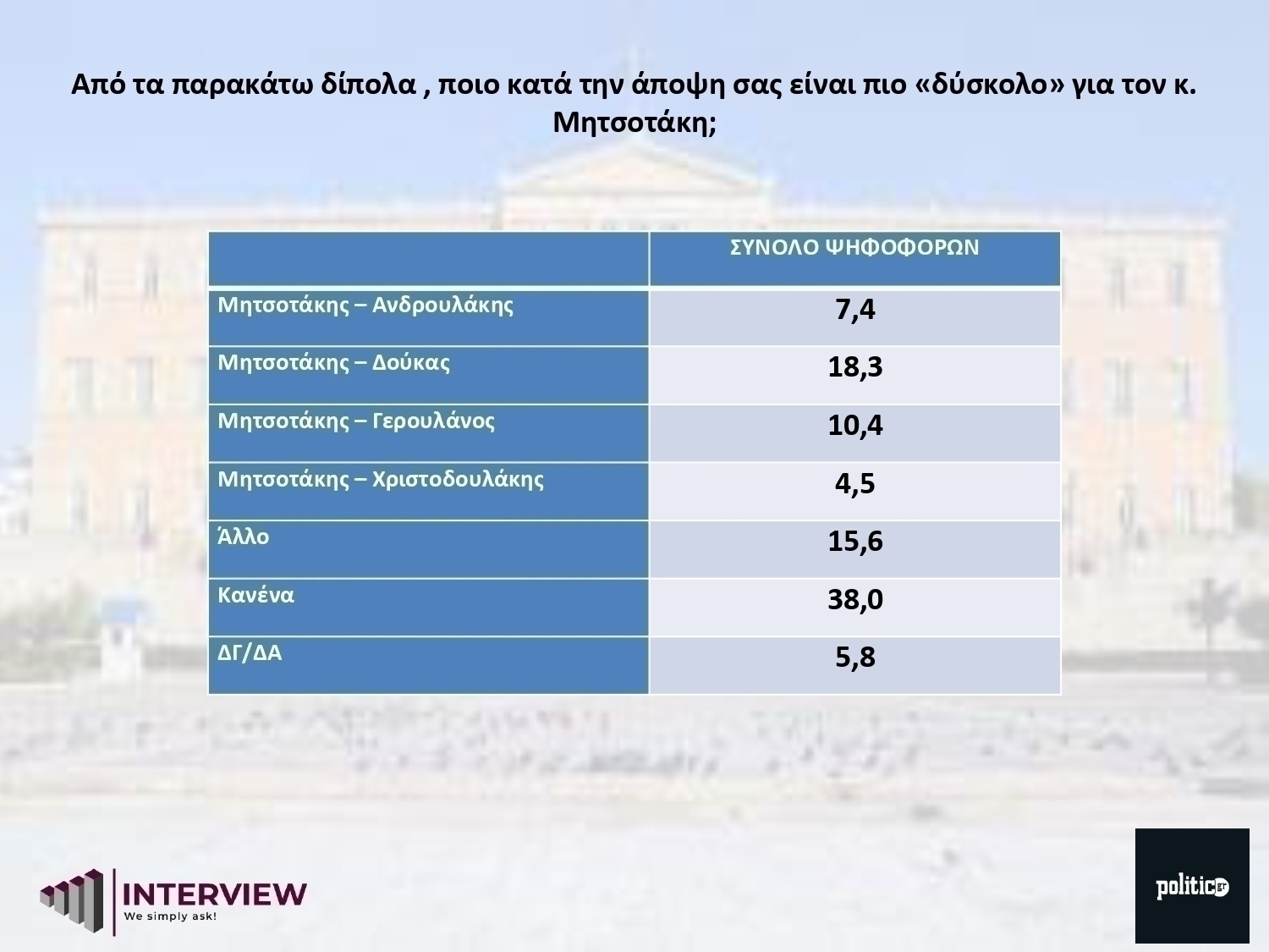 Οι περισσότεροι (38%) απάντησαν ότι «κανείς» από τους υποψήφιους δε μπορεί να ανατρέψει την κυβερνητική σταθερότητα, ενώ μεταξύ των διπόλων, το «Μητσοτάκης – Δούκας» είναι το πιο υπολογίσιμο (18,3%) με αρκετό «αέρα» σε σύγκριση με τους άλλους υποψήφιους του ΠΑΣΟΚ. Μάλιστα, μετά τον Χ. Δούκα, μεγαλύτερη απειλή παρουσιάζει η υποψηφιότητα του Π. Γερουλάνου (10,4%) και τρίτος έρχεται ο Ν. Ανδρουλάκης (7,4%).