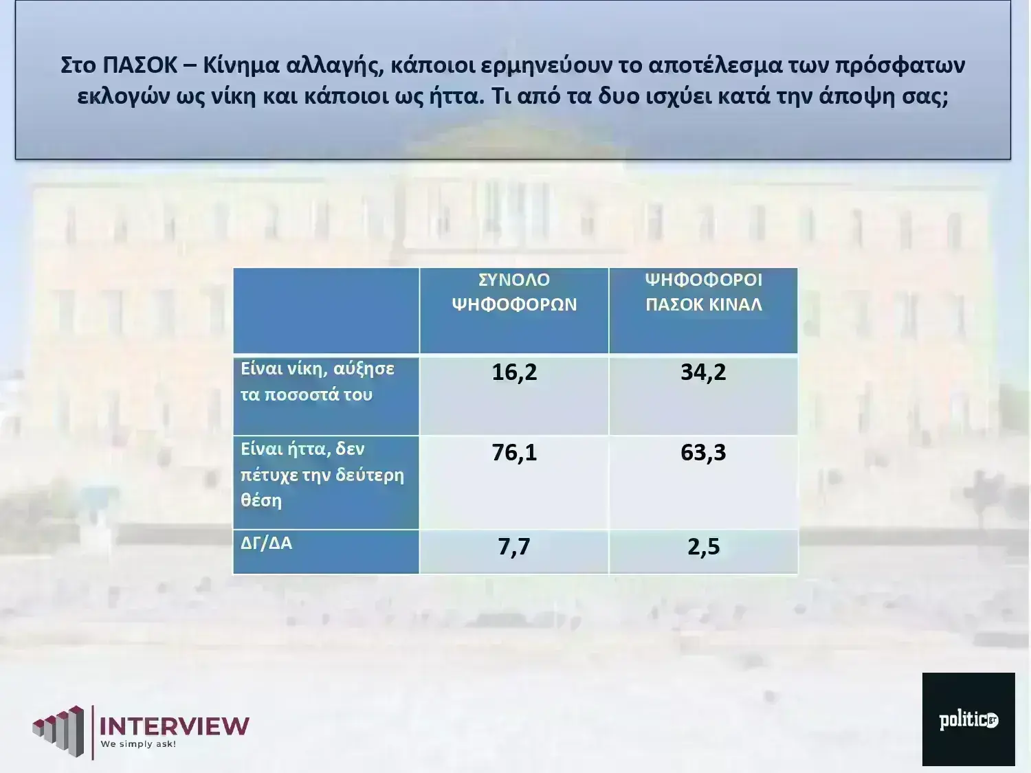 Τέλος, ως «ήττα» λογίζεται τόσο από τους ψηφοφόρους του ΠΑΣΟΚ (63,3%) όσο και από τους υπόλοιπους (76,1%) το αποτέλεσμα των ευρωεκλογών καθώς παρ’ ότι το κόμμα αύξησε το ποσοστό του σε σύγκριση με τις εθνικές εκλογές του Ιουνίου 2023, αλλά και εξέλεξε και έναν ευρωβουλευτή περισσότερο σε σχέση με το 2019, δεν κατάφερε να αναρριχηθεί στη δεύτερη θέση μπροστά από τον ΣΥΡΙΖΑ.
